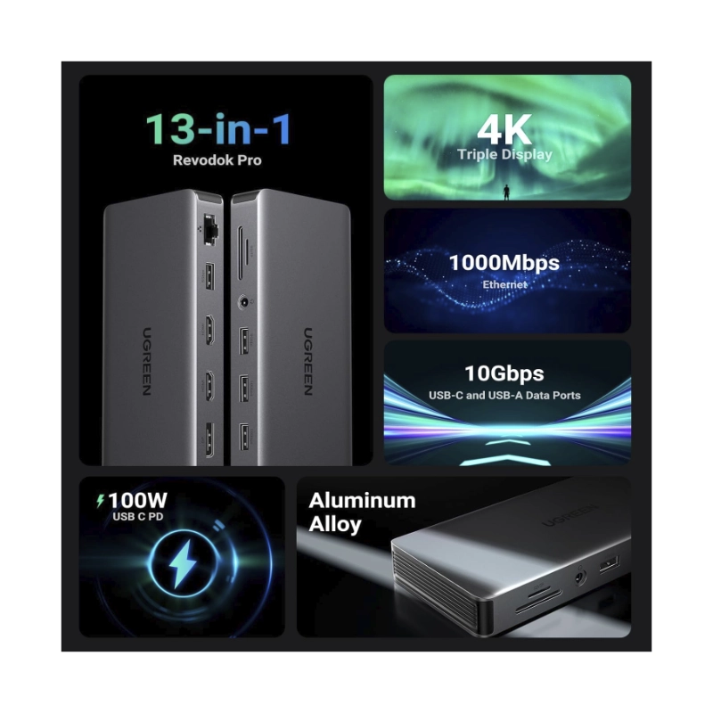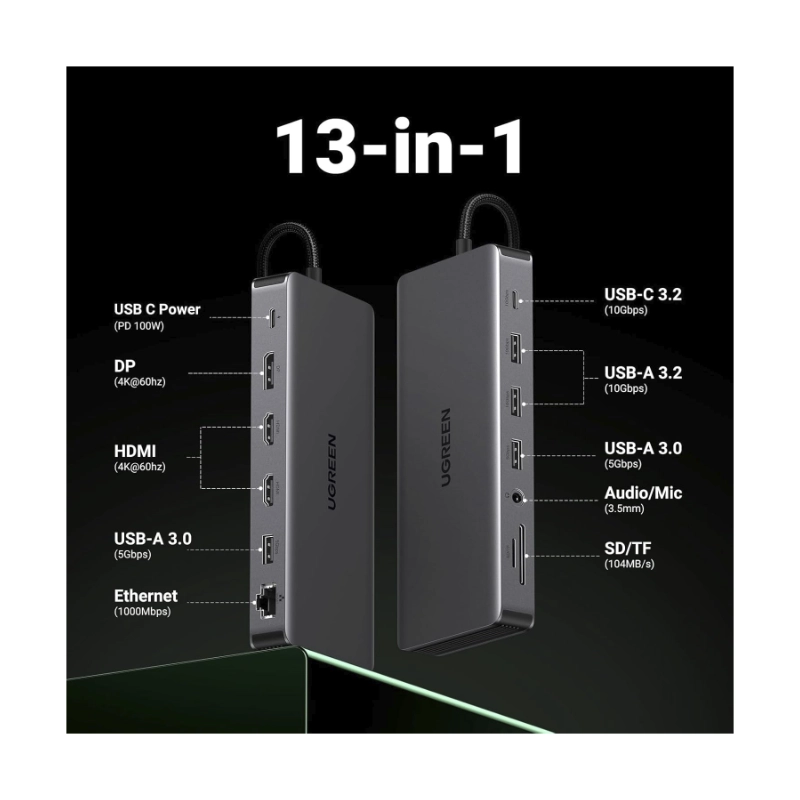 Adaptador Usb-C A 13 En 1 Ugreen Cm681 (15978) Cable 20Cm, X2 Hdmi, X1 Dp, X4 Usb-A, X1 Usb-C, X1 Rj45, X1 Sd Card Slot, X1 Tf Card Slot, X1 3.5Mm