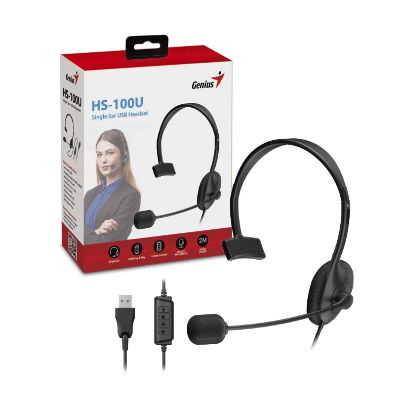 Auricular Genius Hs-100U (31710027400) Negro, Un Solo Oido, Ideal Call Center, Conexion Usb