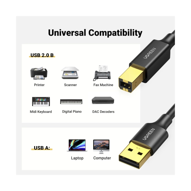 Cable De Impresora Usb A Usb-B Ugreen Us135 (20847) Alta Velocidad, 480Mbs, 2 Metros