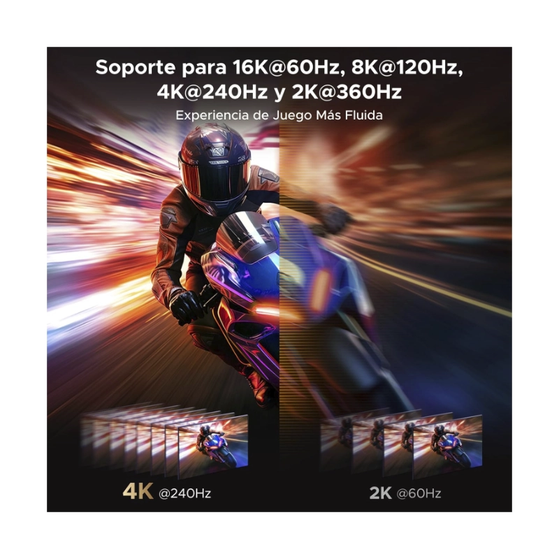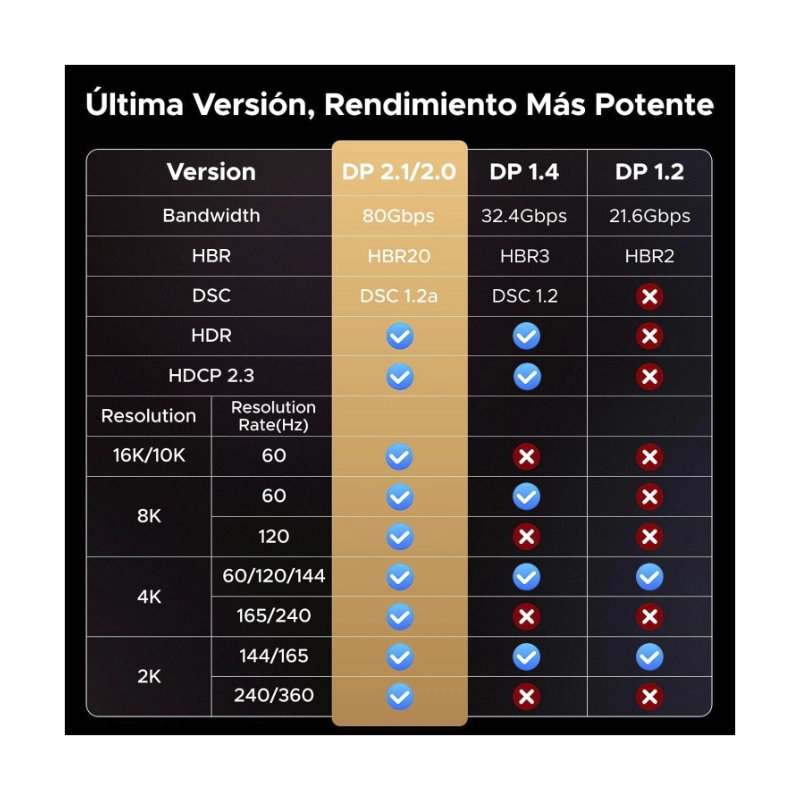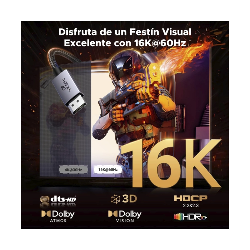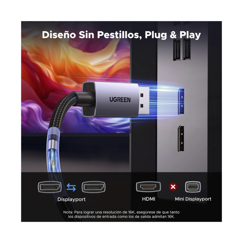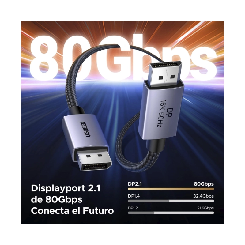 Cable Dp A Dp Ugreen Dp131 (55568) 2.1, 4K/8K/16K, Aluminio Hdr, Hdcp2.3, Dsc1.2A, Freesync, G-Sync, 2 Metros