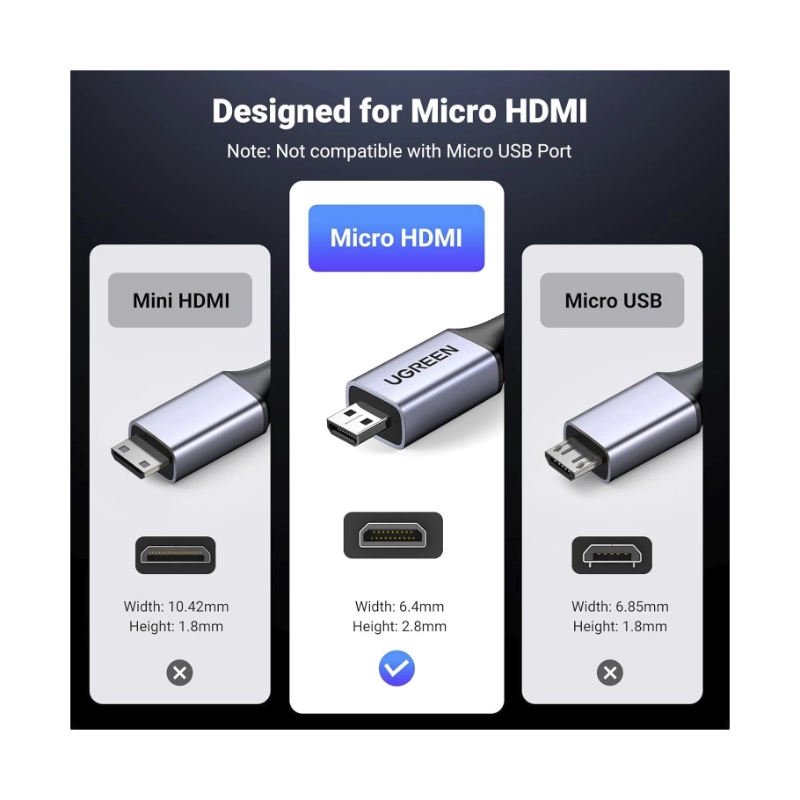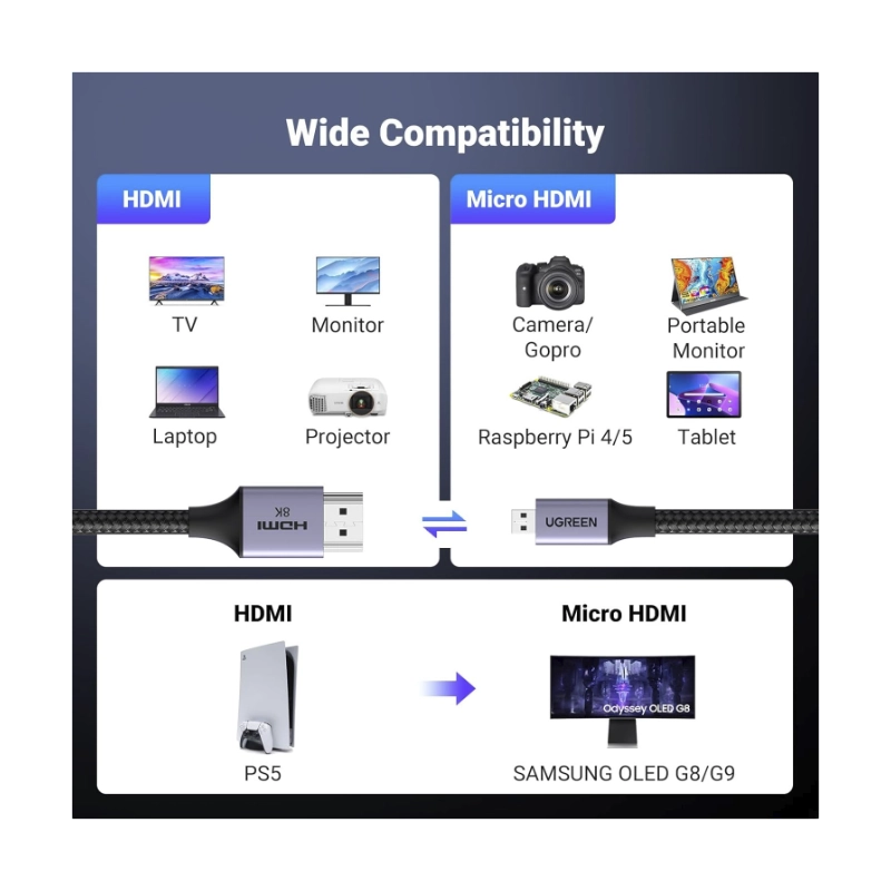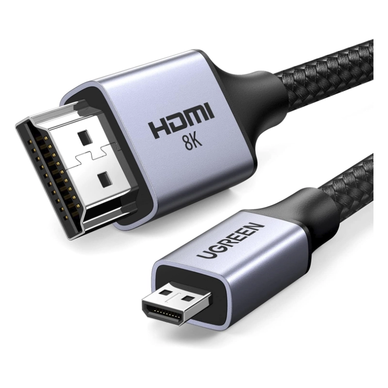 Cable Micro Hdmi A Hdmi Ugreen Hd164 (15517) Carcasa De Aluminio 2.1 Trenzada, Velocidad 8K @60Hz, 4K @240Hz Compatible Con Hdr, 2 Metros