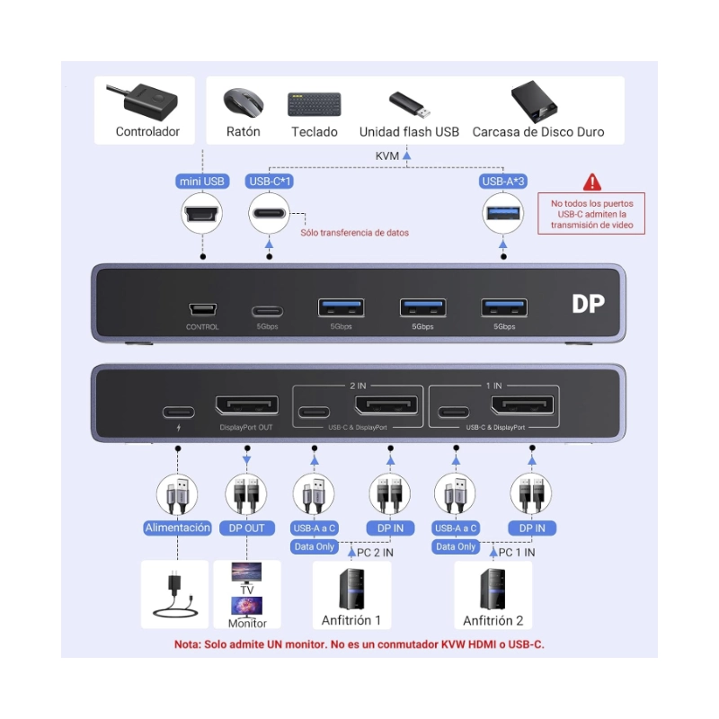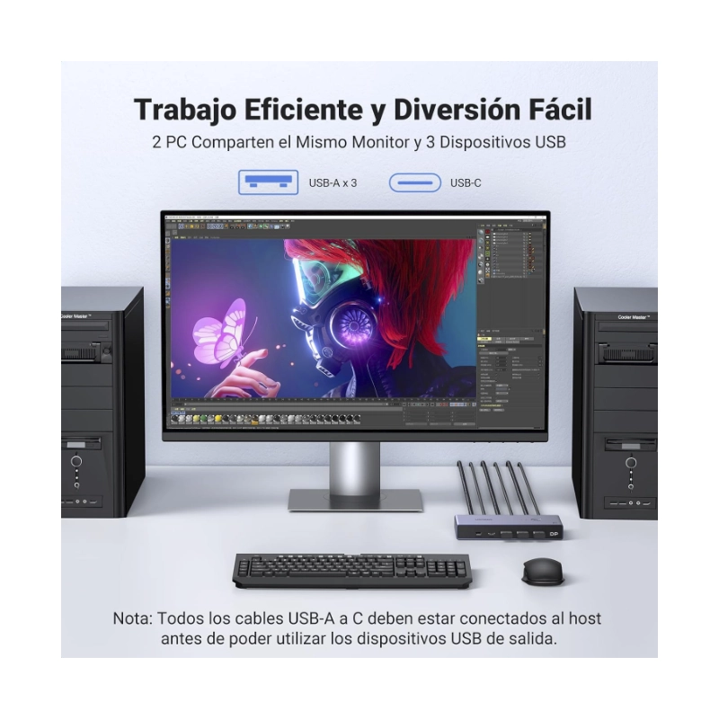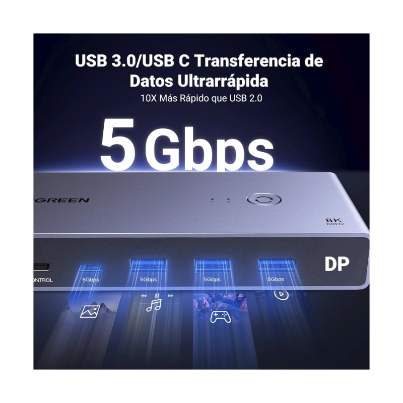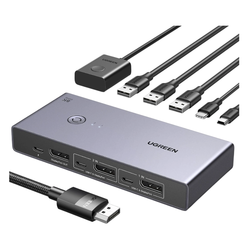 Conmutador Kvm Displayport Ugreen Cm695 (25962) Para 2 Computadoras Que Comparten 1 Monitor, Teclado, Mouse, Discos Duros, Impresora, Con 2 Cables Dp