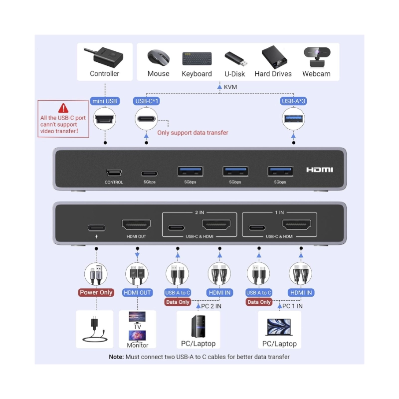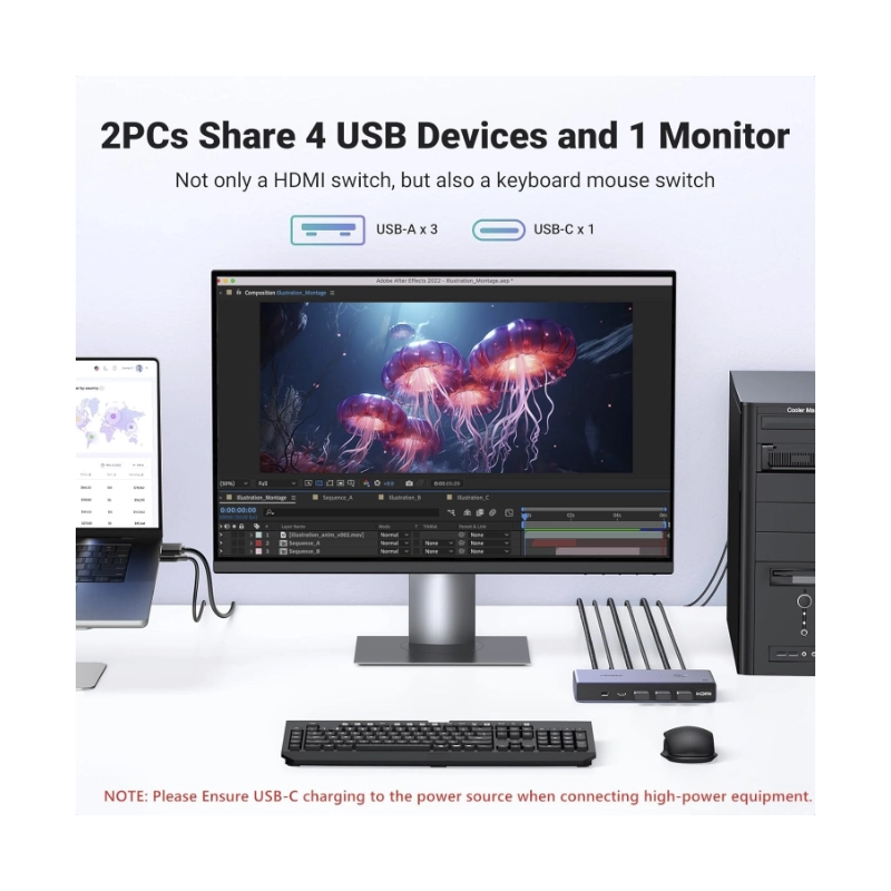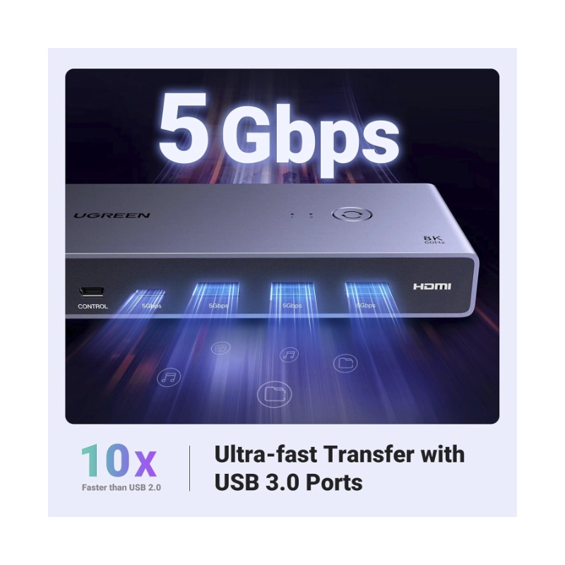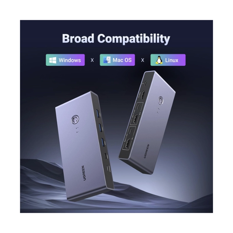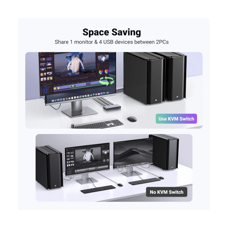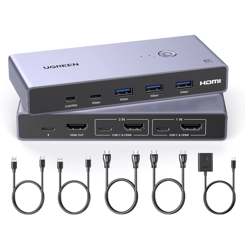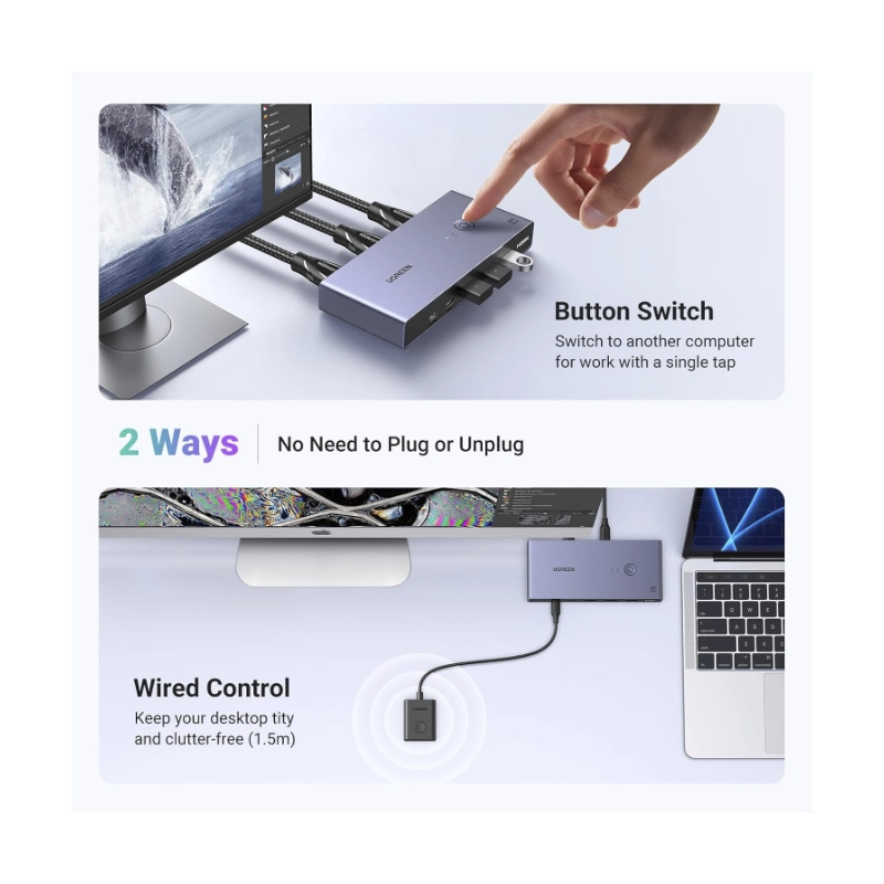 Conmutador Kvm Hdmi Ugreen Cm692 (25961) Para 2 Computadoras Que Comparten 1 Monitor, Teclado, Mouse, Discos Duros, Impresora, Con 2 Cables Hdmi Y Usb