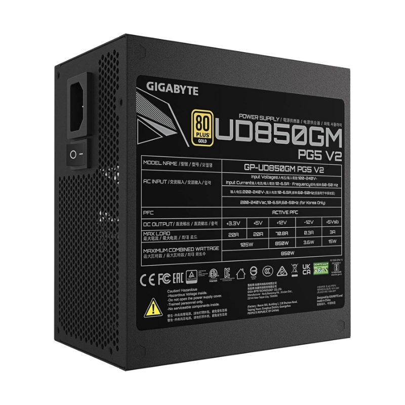 Fuente De Poder Gigabyte Ud850Gm Pg5 V2 (Gp-Ud850Gm Pg5 V2) 850W, Gold, Pcie Gen 5.1, Atx3.1, Modular