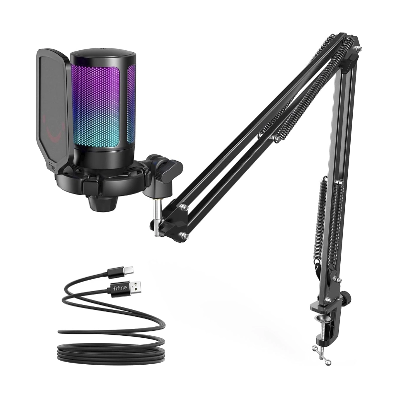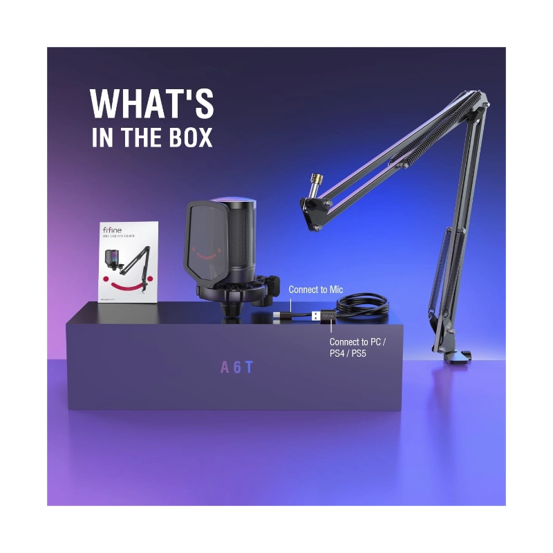 Microfono Fifine A6t Ampligame (A6t-b) Con Soporte De Brazo, Negro, Boton De Silencio Para Transmision, Pc/ps4/ Ps5, Led-rgb