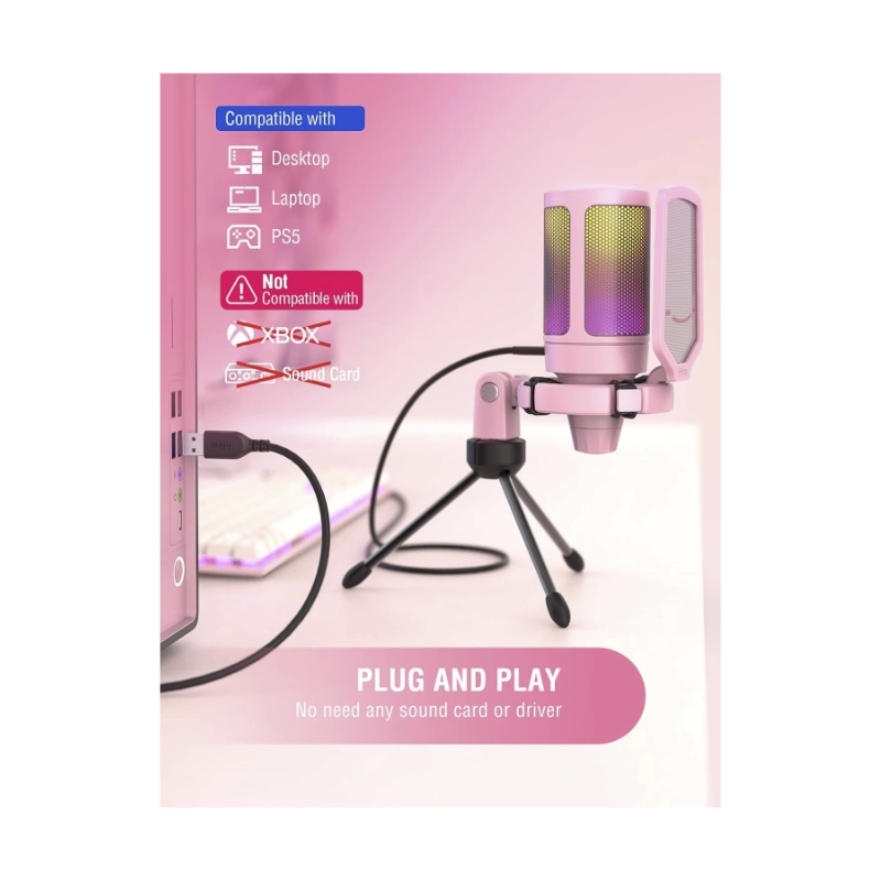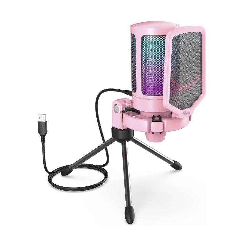 Microfono Fifine A6v Ampligame (A6v-p) Rosado, Filtro Pop, Montaje De Impacto, Condensador Con Silencio Rapido, Para Pc/ps5, Led-rgb