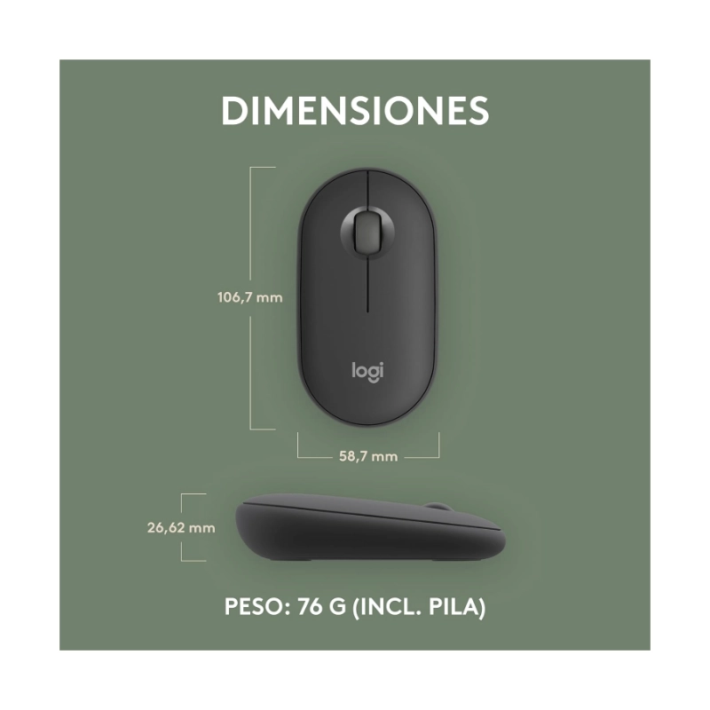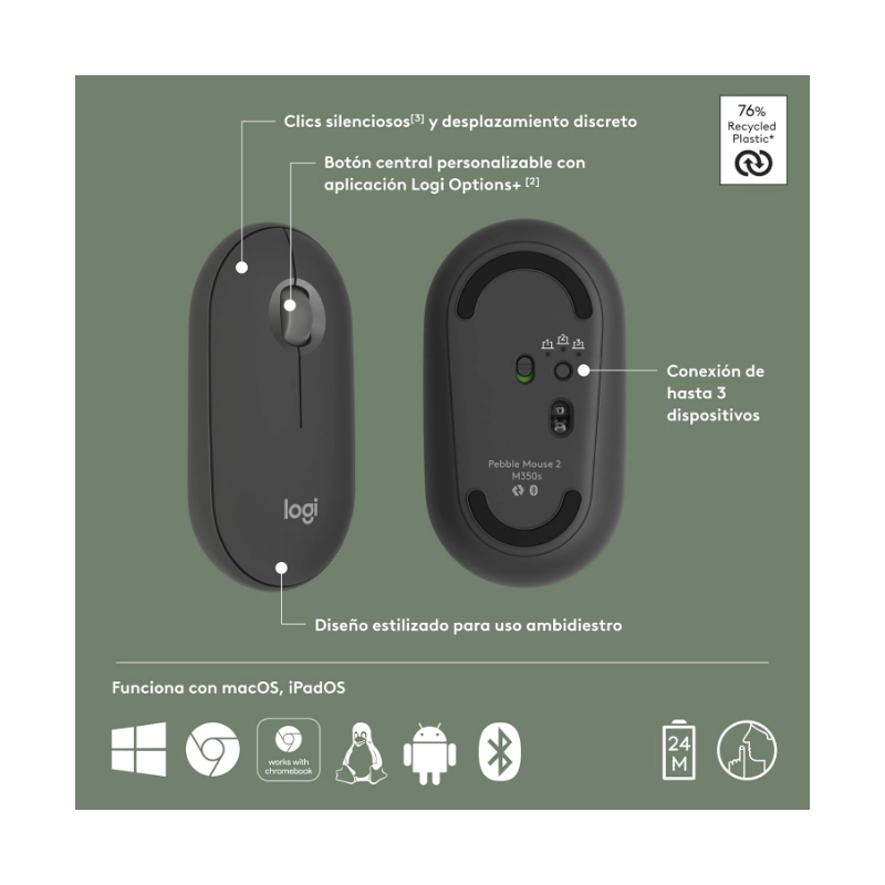 Mouse Inalambrico Logitech Pebble Mouse 2 M350S (910-007049) Grafito, Bluetooth, Ligero, Personalizable, Clicks Discretos, Easy-Switch, Recargable