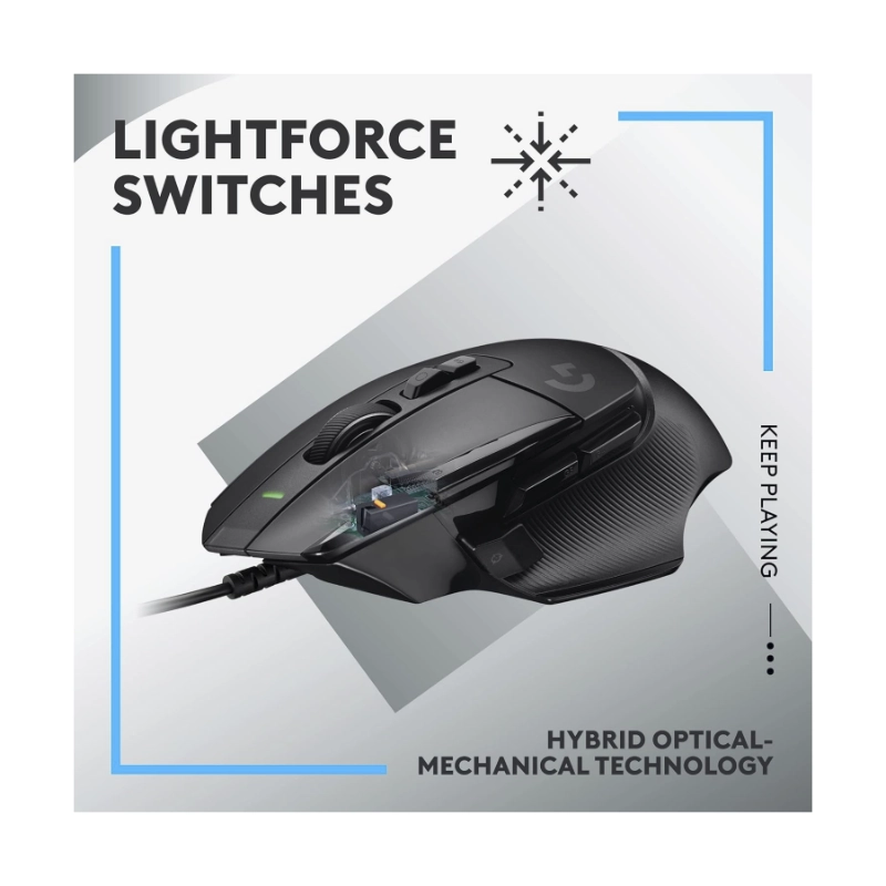 La innovación más importante en el G502 X son los nuevos switches híbridos óptico-mecánicos LIGHTFORCE. Esta tecnología revolucionaria combina la velocidad y la fiabilidad de los switches ópticos con la sensación táctil y la respuesta nítida de los switches mecánicos. Disfruta de una velocidad de actuación increíblemente rápida sin el riesgo de doble clic, lo que te da una ventaja crucial en los juegos competitivos. Cada clic se siente preciso y satisfactorio, ofreciéndote un control absoluto sobre tus acciones en el juego.