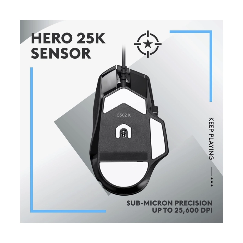En el corazón del Mouse Logitech G502 X se encuentra el sensor óptico HERO 25K. Con una resolución máxima de 25,600 DPI, este sensor de última generación ofrece una precisión inigualable sin aceleración, suavizado ni filtrado. Ya sea que necesites movimientos ultrarrápidos o un apuntado preciso, el sensor HERO 25K garantiza que cada movimiento de tu mano se traduzca fielmente en la pantalla. Esta precisión a nivel de submicrón te da la confianza para realizar cualquier jugada.