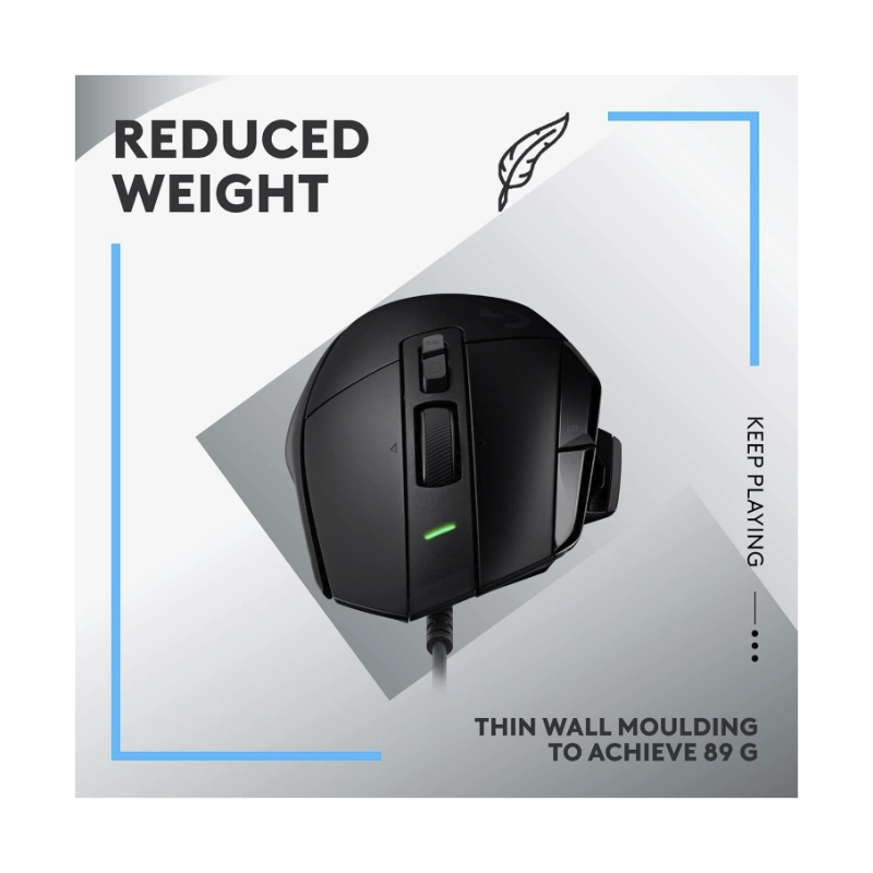 Una de las mejoras más significativas en el Logitech G502 X es su drástica reducción de peso. Con solo 89 gramos, el mouse es increíblemente ligero, lo que reduce la fatiga de la mano durante las largas sesiones de juego y permite movimientos más rápidos y fluidos. La forma icónica del G502 ha sido optimizada para un mejor agarre y una comodidad superior. Los agarres laterales de goma son más finos y resistentes, y el diseño general del mouse G502 X se siente perfectamente equilibrado en la mano.