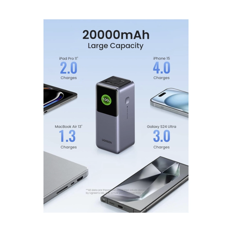 Power Bank Ugreen Pb720 (25188) Portatil Nexode, Pantalla Digital, 3 Puertos Pd, Carga Rapida De 100 W, 20000Mah