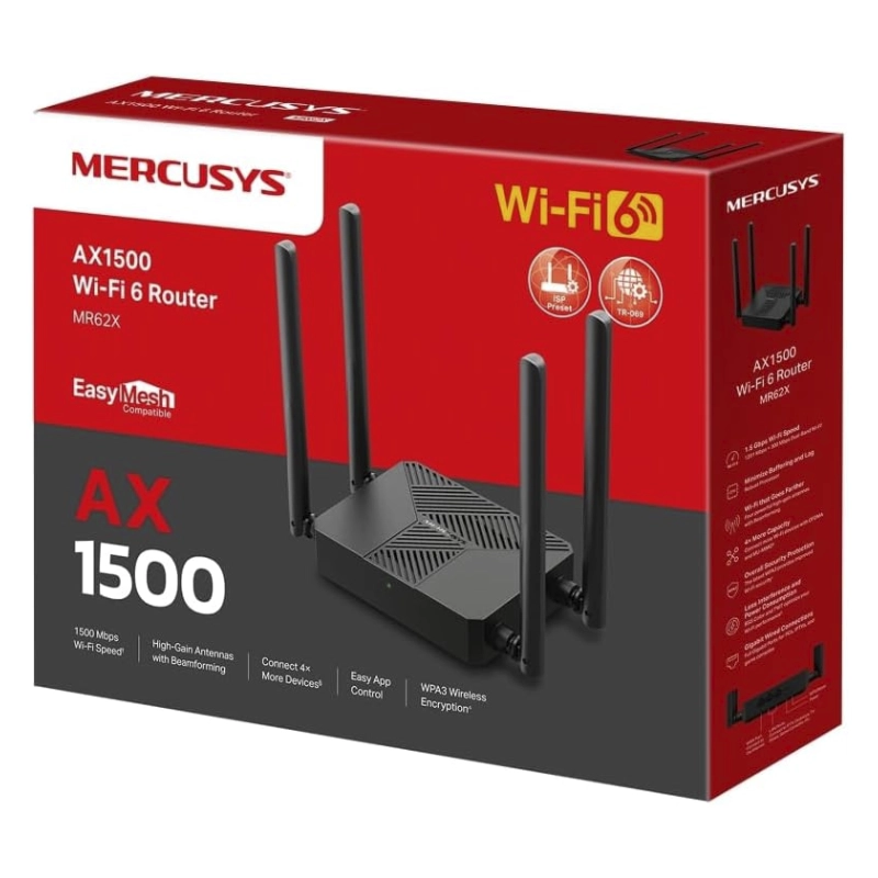 Router Inalambrico Mercusys Ax1500 (Mr62X) Wi-Fi 6, 2.4Ghz/300Mbps, 5Ghz/1201Mbps, Antena X4, Port X2 Lan 10/100/1000Mbps, Port X1 Wan 10/100/1000Mbps