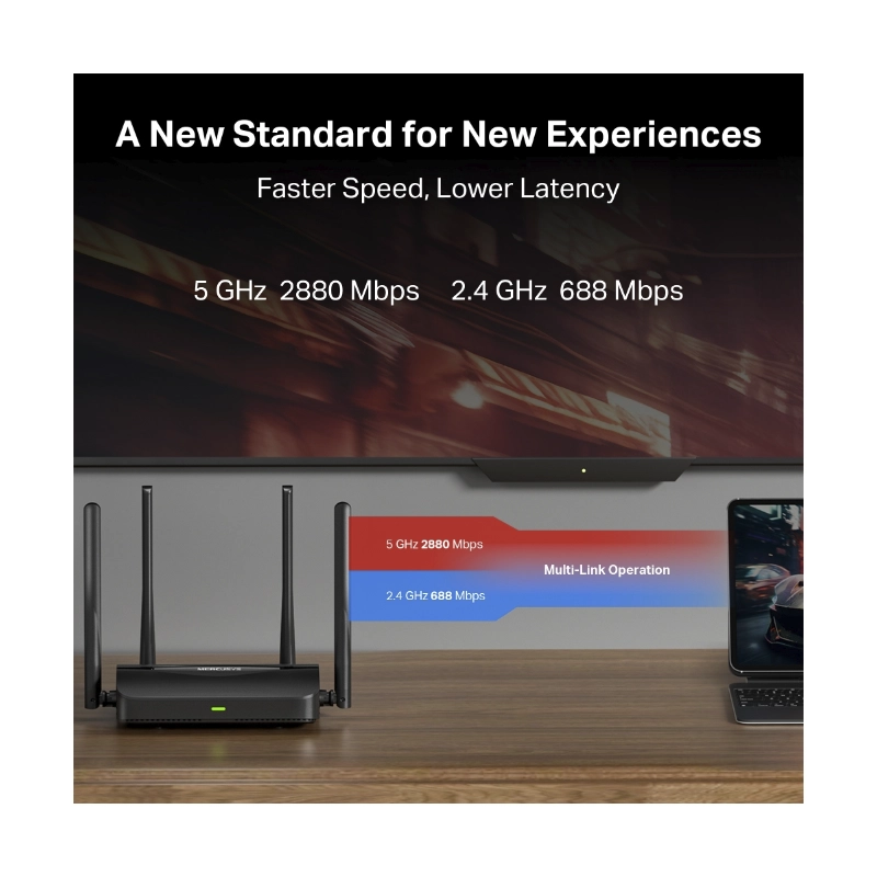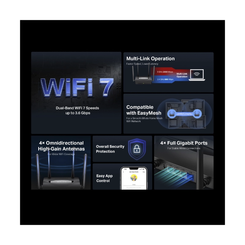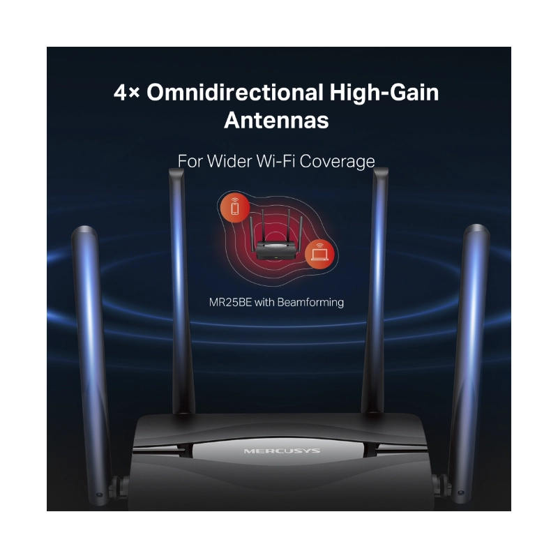 Router Inalambrico Mercusys Be3600 (Mr25Be) Wi-Fi 7, 2.4Ghz/688Mbps, 5Ghz/2880Mbps, Antena X4, Port X4 10/100/1000Mbps, Vpn, Mlo, Canal De 160 Mhz+