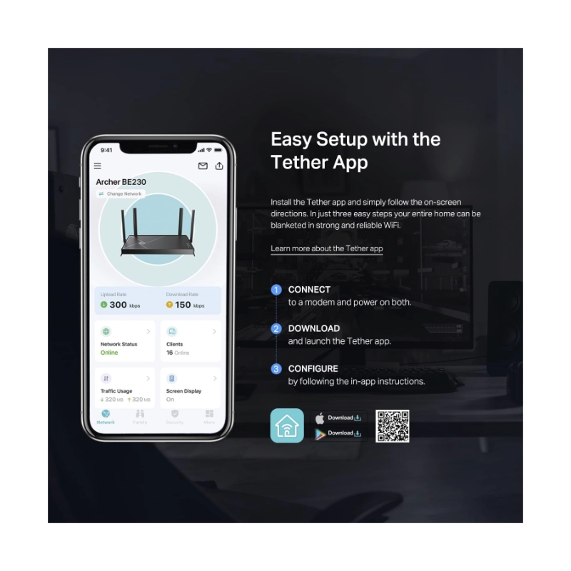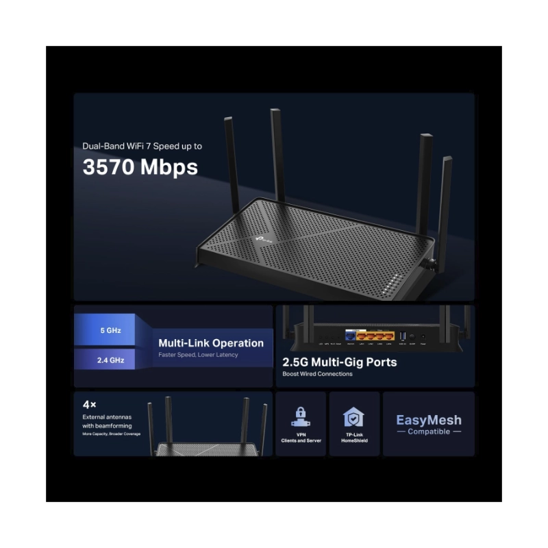 Router Inalambrico Tp-Link Be3600 (Archer Be230) Wi-Fi 7, 2.4Ghz/688Mbps, 5Ghz/2882Mbps, Antena X4, X2 Lan 1 Gbps, X1 Wan 2.5 Gbps, X1 Lan 2.5 Gbps
