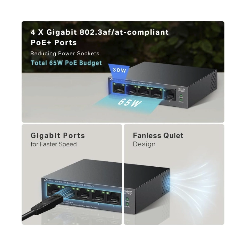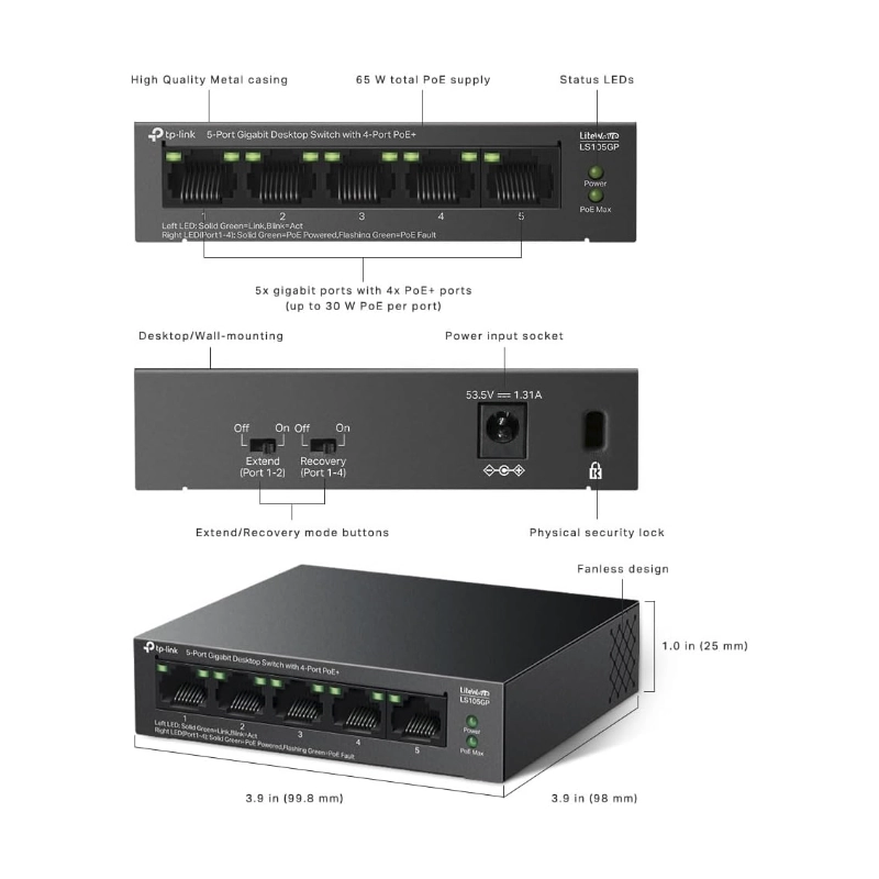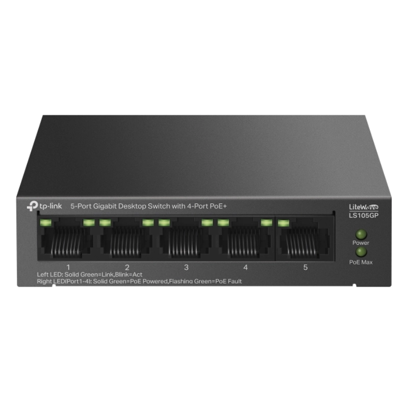 Switch Tp-Link 5 Puertos Con Poe+ (Ls105Gp) 10/100/1000Mbps, 250 Metros, Alimentan Facilmente Dispositivos Como Camaras Ip, Carcasa Metalica