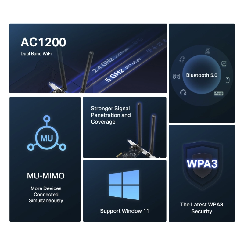 Tarjeta Pcie Inalambrico + Bluetooth 5.0 Mercusys Ac1200 (Ma30E) 2.4Ghz/300Mbps, 5Ghz/867Mbps, Antena X2, Mu-Mimo, Wpa3