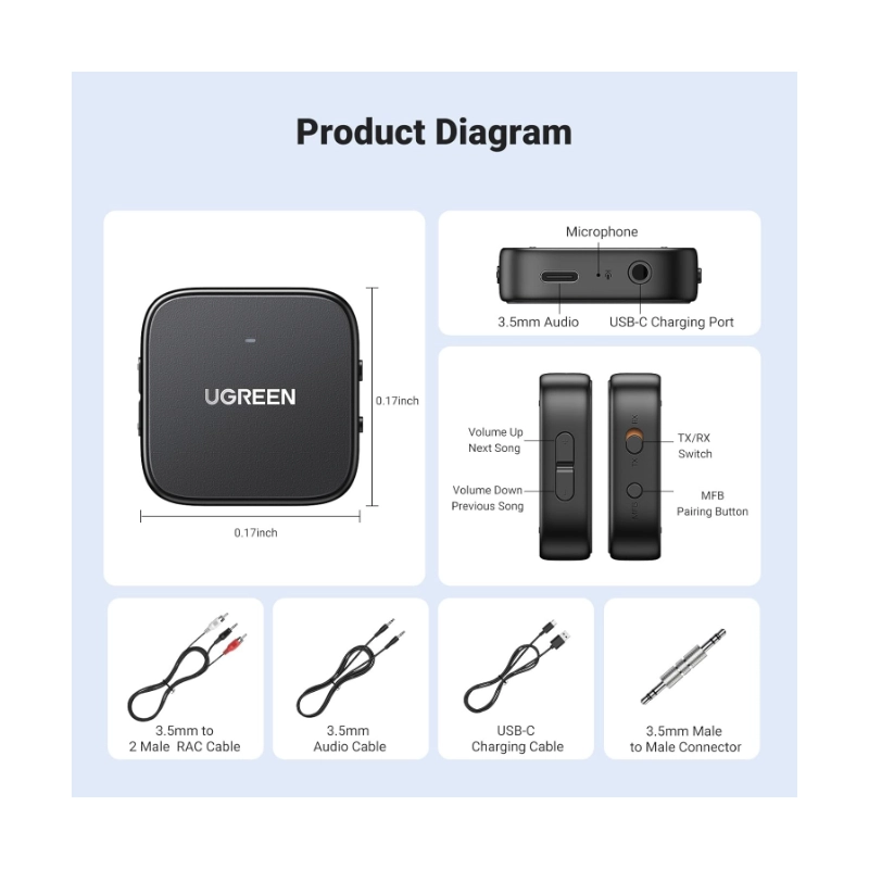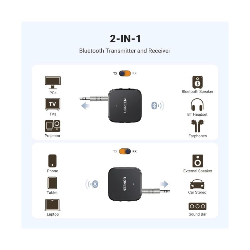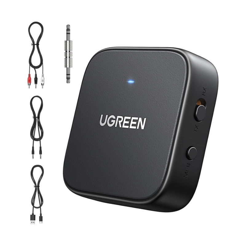 Transmisor Receptor Bluetooth Ugreen (35223) Bt 5.2, Adaptador Aux Jack 3.5Mm Y Rca, Audio Inalambrico Con Microfono, Pc Altavoz Amplificador