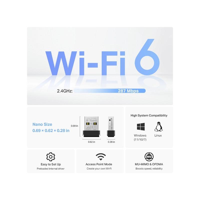 Usb Inalambrico Tp-Link Ax300 (Archer Tx1U Nano) Wifi 6, Nano, Banda 2,4 Ghz, Hasta 287 Mbps